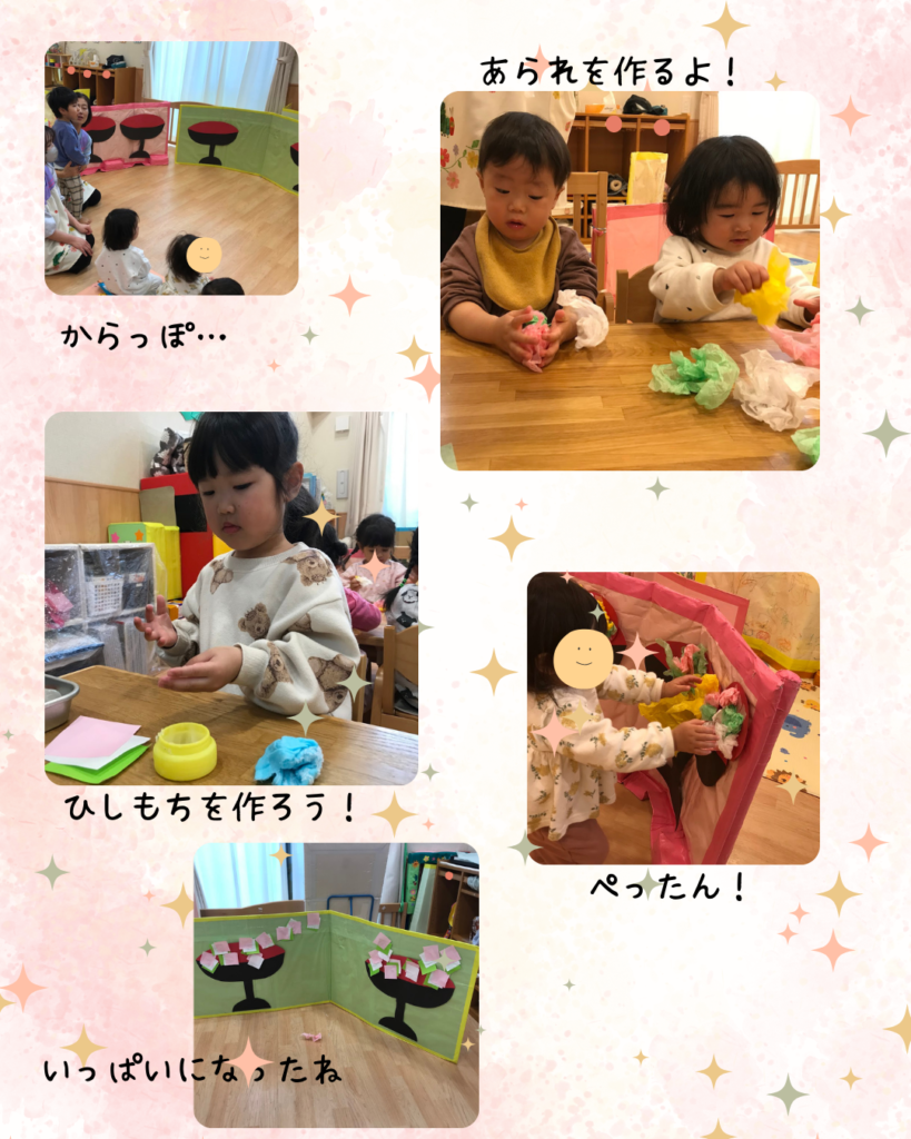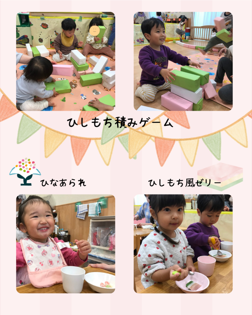 その後は、ひしもちをどれだけ高く積めるかチャレンジしたり、パネルからいなくなってしまったお雛様たちを探すゲームをしてひなまつりを楽しんだ子どもたちでした😊