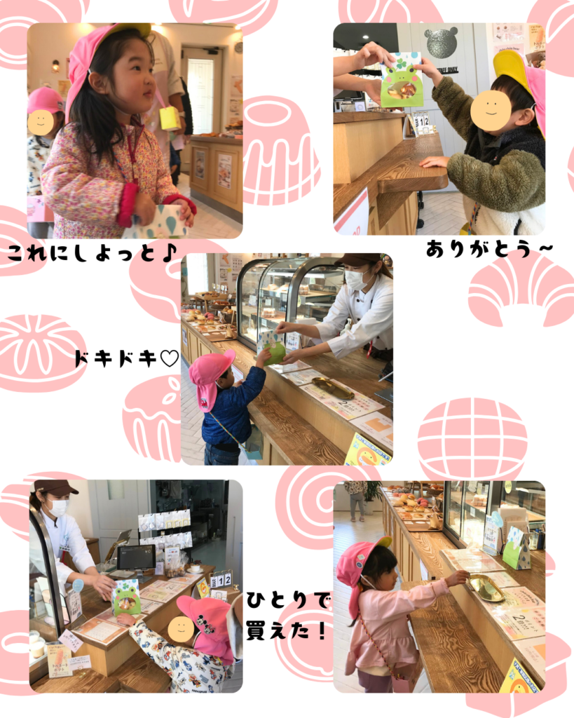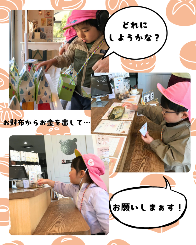 今回シュシュベアーさんが子どもたちのために、ミニパンのセットを用意してくださいました!子どもたちが自分で好きなセットを選んで、レジに持っていきます😀大事に持ってきたお財布からお金を出して、店員さんからパンを受け取ることができました!少しドキドキしながらも、とっても嬉しそうな子どもたちでした😊「お願いします」や「ありがとう」が言えてさすがもも組さんでした!買ったパンはおうちでパパやママと一緒に食べてね♪