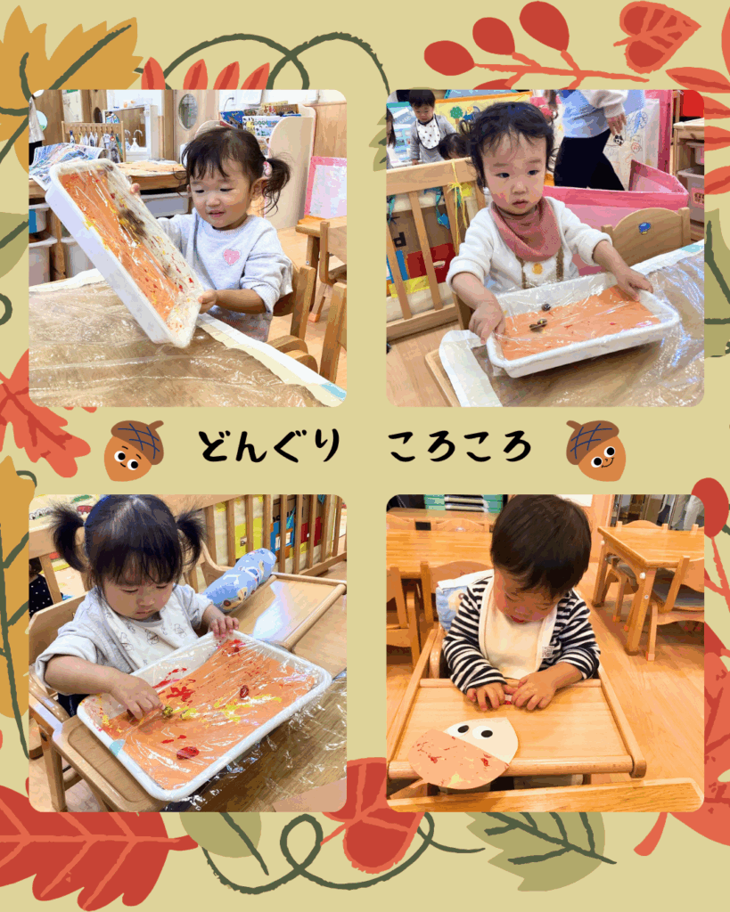 みどり組とそら組は、絵具を付けたどんぐりを画用紙の上で転がし、模様を描きました😀そしてどんぐりの帽子の形にカットしてもらい、目や口を貼り付けて、表情豊かなどんぐりに仕上げました♪